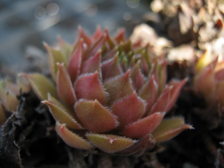sunshine it developed a strong reddish-violet blush. The AGS online encyclopedia says: "A compact plant with smallish brown-red rosettes." The Sempervivum List says: "Rosettes of medium size, pink -red rosettes, in the middle to bronze - green alternating." |