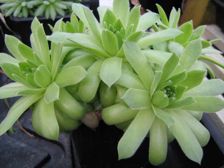 A fairly large growing green leaved species from the Atlas Mountains. It is the only species to stray beyond the bounds of Europe. Plants of the World online says: "The native range of this species is Morocco. It is a succulent perennial and grows primarily in the temperate biome. Alan Smith said: "This is the only representaive of the genus to be found in the African Continent; Great Atlas mountains of Morocco. When it was first collected in 1871 by J. D. Hooker, Maw and Ball, it was described as a variety or subspecies of S. tectorum, to which it only bears a superficial likeness. The rosettes are 4 to 8 cm. in diameter, suberect, often lop-sided and asymmetrical, pale green, flushed red when grown fully exposed to sun. The rosette leaves are pubescent on both faces and abruptly contracted at the tips. Offsets are produced freely on very short stolons so that the plant forms a regular hump of rosettes. Flower-stems are 15 to 25 cm. high, having the tendency to produce flower-buds in the upper leaf axils. Cauline leaves usually coloured bronze-red. Petals pale pink with a deep pink median band; filaments crimson, anthers dull green. The flowers are rarely produced under cultivation. Easy species to cultivata although not too hardy in the severest winters." |