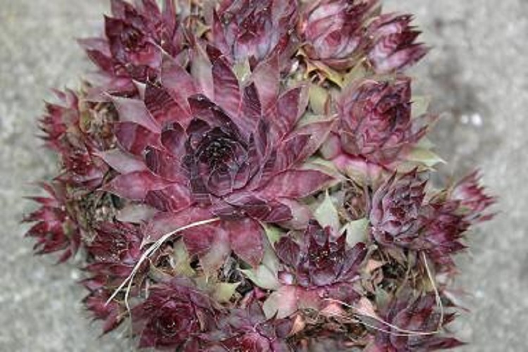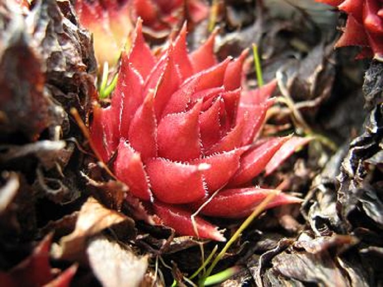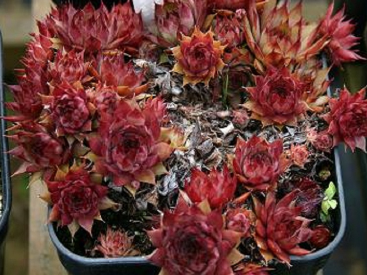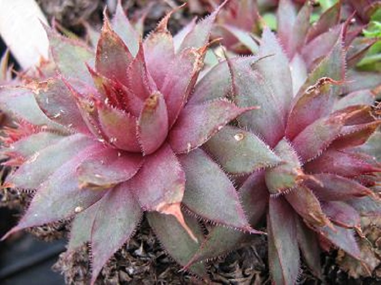 since it was raised by Sandy MacPherson in the USA. Registered in 1962. On Sempervivum List, Horst Diehm says: "small brownish - olive-green rosette with pointed foliage and reddish-purple tips, base more reddish tinted." Sempervivums by Post say: "'Blood Tip' is super-tough, always looks great, and forms a fantastic clump (partly because it rarely flowers). We've grown this type for over 30 years and it's never failed. |
