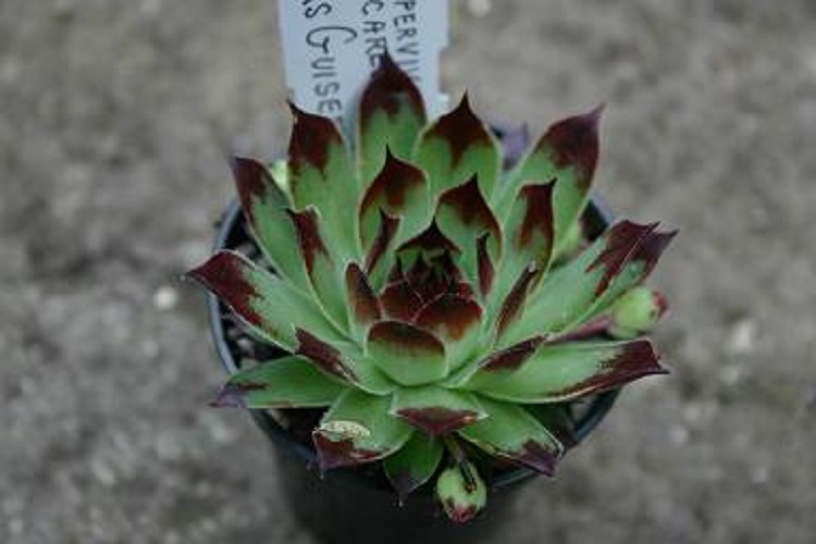 I got it from Simon Bond at Thuya Apines. Erwin Geiger is quoted on Sempervivum List saying: "One of the most beautiful cultivated forms of the species with high-contrast rosettes up to 6 cm in size. The name is often misspelled or sometimes even with the natural hybrid S. x Giuseppii." Mountain Crest Gardens say: "Sempervivum calcareum 'Mrs. Giuseppi' (Giuseppi): A green rosette with contrasting, dark red tips. It is a strong grower and survives cold, wet winters better than most Sempervivum. This variety produces lots of offsets on very short stolons." |