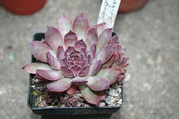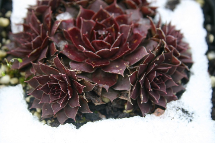 'Crispyn' is one that I like. It is colourful, blue and red. It is vigorous and trouble-free. Mostly it is comely and charming. I got it from Trecanna Nursery and was irrationally fond of it from the moment I got home. My plant would seem to be the form introduced by Howard Wills (rather than the form raised by Gustaaf v.d. Steen in Belgium in 1974). Sempervivums by Post warn that: "'Crispyn' (AGM form) should not be confused with 'Crispyn' (Belgium form) because two different plants exist with the same name. This particular 'Crispyn' was given a prestigious Award of Garden Merit by the RHS following the 205-2008 trials, described by the judges as: "Lovely distinct dark colour; compact plants." " Erwin Geiger, quoted on Sempervivum List, says: "medium-sized rosettes with velvety leaves and therefore looks strikingly shiny, especially in spring." Howard and Sally Wills show the plant that I grow and say: "Dark greyish-purple rosettes of pointed leaves." but, rather confusingly, attribute their plant to a Belgian hybridist. |