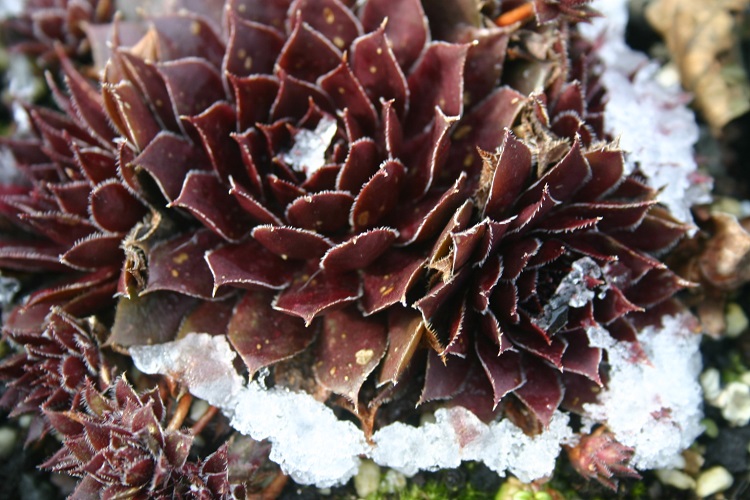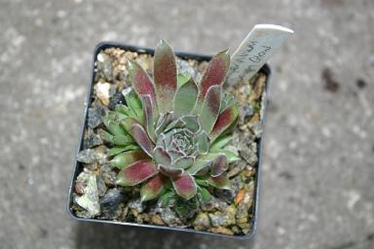 it was raised by Sue Thomas and registered in 1999. Volkmar Schara is quoted on Sempervivum List saying: " 'Devon Glow' is a medium-sized houseleek. The rosettes sprout willingly and form very dense cushions. The bright orange colors are especially beautiful in summer!" Sempervivum Nursery say: "Rosettes in red-gold glowing colors. In midsummer, the rosettes turn green and show only reddish-brown leaf tips. They are then hardly distinguishable from 'Ginger Nut'." |