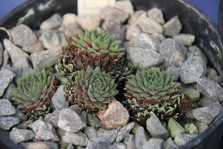 Writing in the Bulletin of the Alpine Garden Society in 1935, Hugh Miller says: "(Sempervivum) erythraeum Velenovsky is a beautiful species. The rosettes are flattish, wide open with very many leaves, greyish-green, some forms with an opalescent flush. The leaves are covered with minute white hairs - generally visible only uder a magnifying glass. The flowering-stem and flowers are also very hairy, the narrow petals being purplish-red colour. The offsets are always on very short stolons so that the plant forms a compact tuft. It needs glass protection in winter and is perhaps the most tender of the Eusempervivum section of the genus." In April 2012, Cecilia Coller exhibited the plant at the AGS London show and was awarded a Certificate of Merit. The report in the Bulletin says: "Her second Certificate of Merit went to an immaculate pan of Sempervivum erythraeum. Unusual in this genus for its understated, velvety grey-green leaves, tinted with pink, and acknowledged as slower than most to bulk up, this Bulgarian endemic spends most of its time in an alpine house, which prevents birds from pecking the rosettes and avoids the compost becoming too soggy. Unlike most of its bretheren, it will not tolerate winter wet and should be taken under glass in winter." |