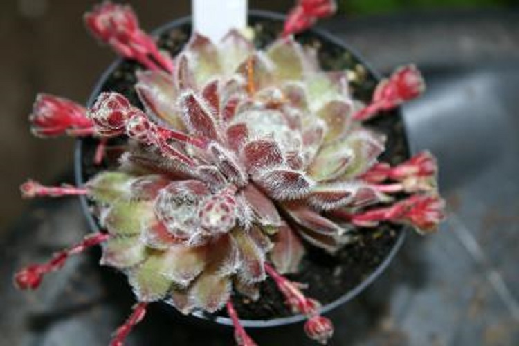 A smallish plant, densely covered with white hairs. Although it is a cultivar of S. arachnoideum it lacks the cobweb effct of typical the species