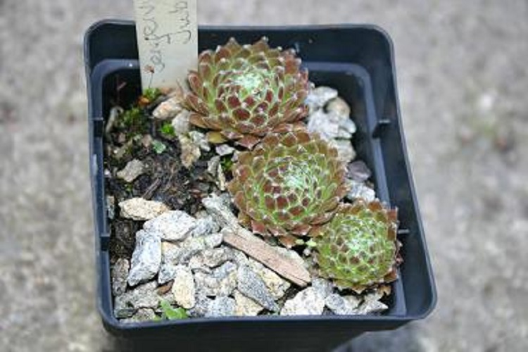 when it came from a local garden Centre. Raised in 1969 by A. Hansen in the UK, a hybrid betweem S. 'Stansfieldii' and S. montanum. Horst Diehn said: "medium-sized, pointed rosettes, sapphire green, lighter inside, with grey hairs, purple flower" Erwin Geiger is quoted on Sempervivum list: "A classic from Great Britain. He became known as early as the end of the 60s. Created by crossing the spider webhouse root with a mountain houseleek. This is why it is referred to as a S. x barbulatum cultivar. The medium-sized rosettes are velvety and, depending on the season, more or less white spun. In spring with a burgundy colour." Mountain Crest Gardens say: " This red and green rosette is lightly tufted and has long cilia lining its leaves. Its leaves close inward to a tight ball and flush rose during its semi-dormancy in winter." |