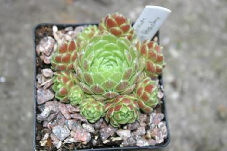very bright when I got it but it is is never as pale as the name suggests. Raised by Sue Thomas in the UK and introduced in 1999. Volkmar Schara is quoted on Sempervivum List: "Sempervivum 'Just Peachy' has medium-sized rosettes and sprouts willingly. The slightly hairy plants show many different shades. The variety name is appropriate." |