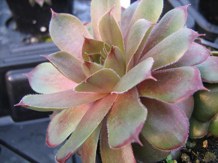 At its best it is a good red/brown rosetted cultivar. A bit dull under cover but superb in a pot outside. Raised by Edward Skrocki in the USA and introduced in 1973. Horst Diehm said: "6 - 8 cm large, flat rosettes, base grey - green, tips dark purple, flower dark red, 15 cm high" The AGS cultivar list says: "A cultivar of merit. Medium-size rosettes of brown, flushed with orange-red. Very good colour throughout spring and summer, but winter colour drab brown." Craigiehall Nursery say: "The rosettes are dark plum-coloured for most of the year giving a long period of interest but in spring the colour brightens and intensifies. The leaves are fairly hard and smooth making Mercury more weather resistant than most but it still demands full sun and good drainage. Seen here growing happily in a handful of soil pressed into a dry stone wall. Definitely one of our favourite dark red Houseleeks and one we have grown for many years. |