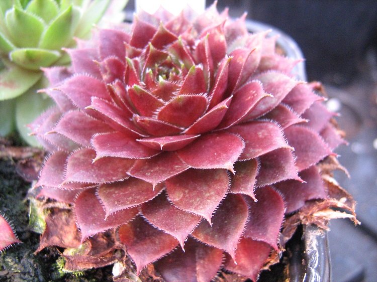 S. marmoreum and is sometime translated as 'Nocturno'. Horst Diehm said: "medium-sized, black-green to dark purple-brown rosettes, with white glandular hairs at the edge, pink flower, 15 cm". Erwin Geiger is quoted on Sempervivum List: "I also received this plant under the name 'Topaz' and S. tectorum pyrenaicum. Attractive reddish-brown rosettes form compact cushions as they rarely bloom!" |