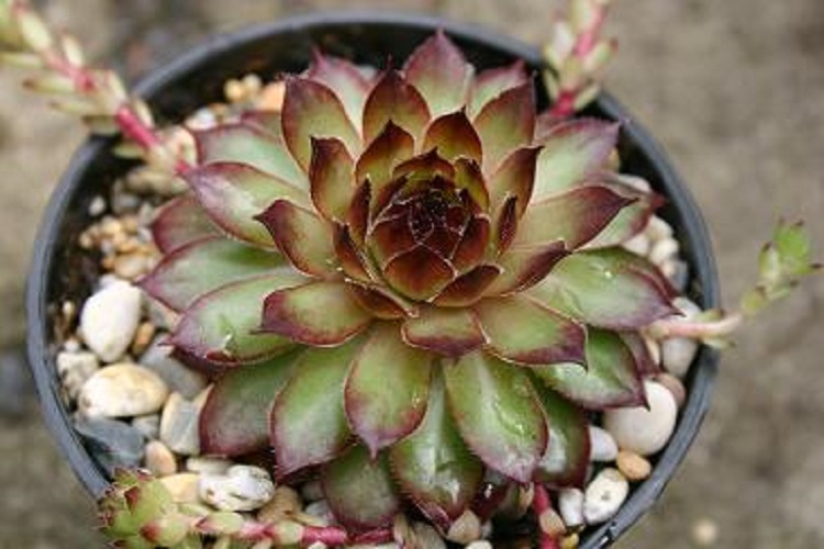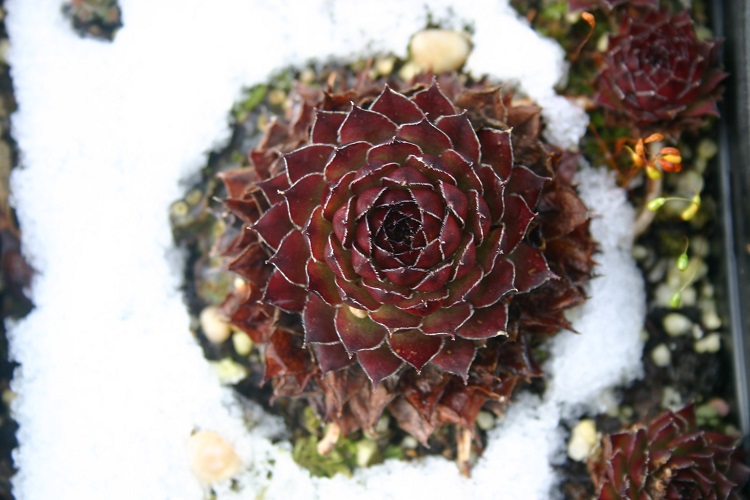 A good dark cultivar that makes tight rosettes. Raised by Nicholas Moore in the UK in 1950. Horst Diehm said: "very dark, medium-sized to large rosettes, widely spread in May, then light green inside and then broad, black-brown tips on the outside, dark olive with black-brown edge in July". Erwin Geiger is quoted on Sempervivum List: "An English hybrid with S. marmoreum and S. tectorum from the 50s. At least two different plants are cultivated under this name. You get the more attractive form of the two, which is most often found in the collections. It has the wider leaves and its spring coloration is darker than that of its competitor. This in turn looks like 'Alternberg'." Sempervivums by Post say: "'Noir' translates from French as 'Black' and this sempervivum really is exceptionally dark coloured in spring. Small rosettes. A forgotten gem from Nicholas Moore (Great Britain, 1950)." |