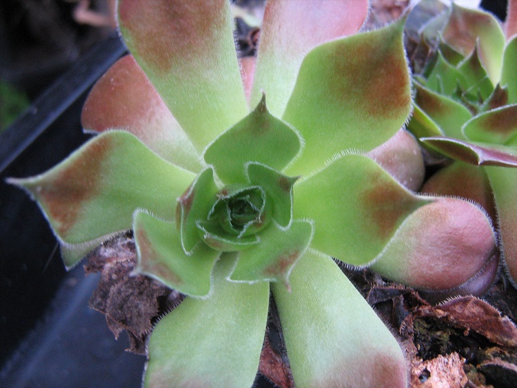 A large growing cultivar with an interesting terra cotta colour through the winter. Raised by Martin Harberer in Germany in 1977. His description says: "Ros. 6-12 cm, wide, dark red with green tips". Horst Diehm said: "approx. 8 cm large, flat, green-red rosettes, base grey-green, edge eyelashes, flower 15 cm, pinkish red" I found that the size of the rosettes reduced very considerably as it formed a clump. Erwin Geiger is quoted on Sempervivum List: "Orion' forms very large rosettes of up to Ø 12 cm in a noble form. Certainly a lot of S. marmoreum 'Rubicundum' in the blood - hence the bright red coloration." Mountain Crest Gardens say: "Sempervivum heuffelii 'Orion': A red and purple colony of rosettes with firm leaves. The edges of these leaves feature silvery cilia that can give the plant a frosted appearance. These are excellent for adding interest to cold garden beds." |
