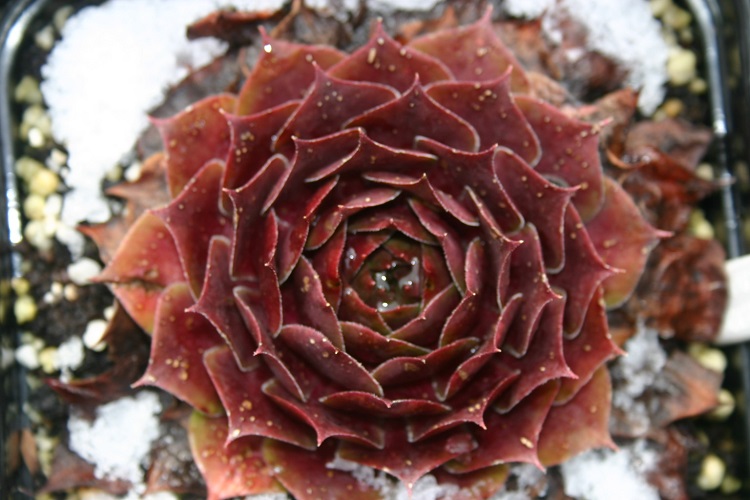 and S. 'Atropurpureum' raised by C. V. Sponnier in Germany in 1959. Erwin Geiger is quoted on Sempervivum List: "Widespread S. marmoreum hybrid, which was selected from 250 seedlings in the viewing garden in Weihenstephan at the end of the 50s. In my opinion, still the most beautiful red variety of this size. Beautifully shaped, up to 16 cm large rosettes, vigorous and robust!" Horst Diehm said: "Very large rosettes. Up to 16 cm. Deep dark brown-red, dark pink flowers, 25 cm tall, very vigorous." Craigiehall Nursery say: "Still one of the largest cultivars available, 'Othello' is outstanding. Given generous growing conditions an individual rosette can easily be as large as a tea plate. The leaves are dark red, especially in the colder months, becoming greener in spring and summer but always with a dark red flush. Allow it some space! Makes a fantastic contrast in a collection with all the smaller rosetted varieties. An RHS Award of Garden Merit Holder. |