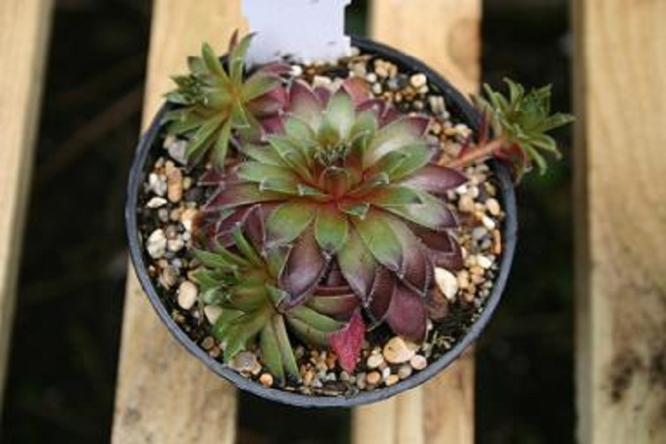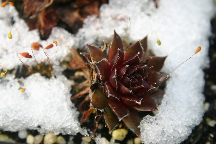 A hybrid between S. marmoreum and S. 'Alpha' raised by Jakob Eschman in Switzerland and introduced in 1967. Horst Diehm said: "up to 8 cm large rosettes, dark purple brown, ciliated at the edges, lasts long into autumn / winter, blossom light carmine pink, 20 cm". Planet Desert say: "The Sempervivum 'Pilatus' is well-known for its deep coloration, symmetrical rosettes with spoon-shaped, pale grey-green leaves, and cold-hardy nature. Its name 'Pilatus' may be inspired by the Pilatus Mountain in Switzerland, which reflects its alpine tolerance and rugged charm. Gardeners and designers appreciate this variety for its year-round structure and ease of care. " |