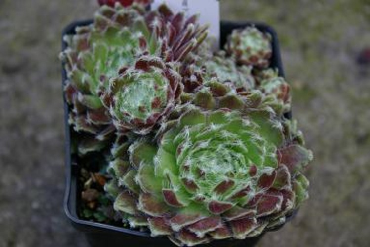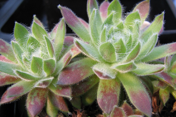 A red blushed cultivar with cobwebbed leaves raised by Ed Skrocki in the USA and introduced in 1988. I bought it from Blackthorn Nursery, their label said: "Pink and green foliage covered in fine silver hair." Horst Diehm said: "approx. 5 cm rosettes, flat, reddish-brown inside, green outside, white ciliated". Sempervivums by Post say: "'Pink Cloud' is another variety bred by Edward Skrocki (USA, 1988). Soft appearance. The offsets look like they're "dancing" around the mother plant. Charming." Mountain Crest Gardens say: "A medium-sized tufted rosette that flushes strawberry pink in the growing season. With shorter days it will revert back to green. Spring brings plenty of new offsets on pink to orange stolons." |