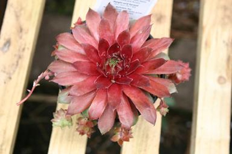 and only grew strongly in the greenhouse. I got it in a garden centre but iut has been around for a long time. In 1981 Bressingham Gardens wrote in their catalogue: "Large, fleshy rosettes of a reddish bronze hue, flowers pink." Raised by Goos and Koeneman in Germany in 1937 from a cross between S. tectorum and S. marmoreum. Horst Diehm said: "ruby - garnet red, medium-sized rosettes, leaves salmon red, flowers salmon red, height 15 cm, needs some nutritious soil" Erwin Geiger is quoted on Sempervivum List: "This gemstone has been in cultivation for decades and is one of the first Sempervivum hybrids. The variety was bred by the Goos & Koenemann nursery, which introduced many peonies, irises and clematis hybrids at the beginning of the century. A classic with ruby red rosettes all year round! Unfortunately, many false plants are now common under this name." Sempervivums by Post say: "'Rubin' is the classic red sempervivum or houseleek and rightly so. It's tough and makes a lovely clump. Looks especially vibrant in spring, but good all year. Originated from Germany in 1937 and has stood the test of time. Should be in every collection." |