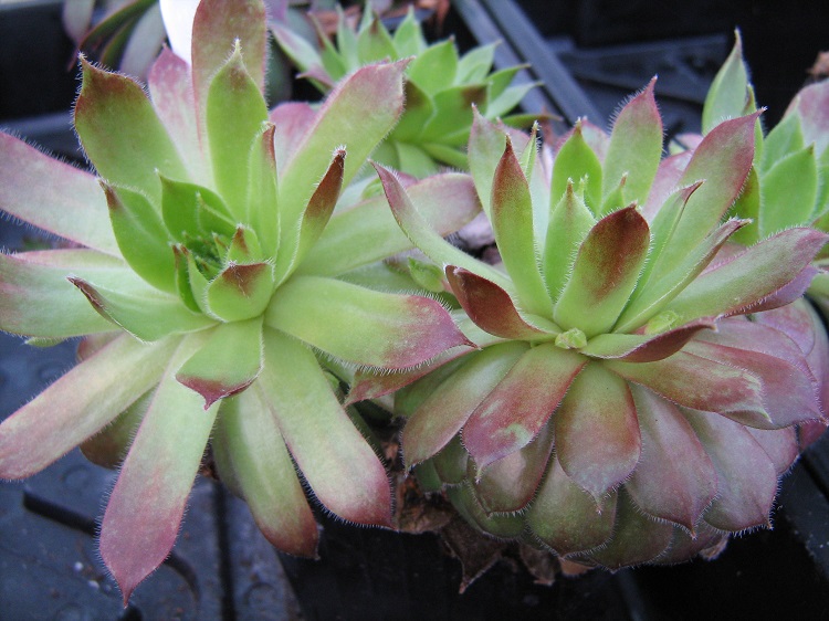 A vigorous green cultivar that developed red tips to the leaves when grown outside. My plant is not the clone that originally bore the name. Sempervivum List say: "the clone currently in circulation is no longer the original clone; however, due to its widespread use, it is still known under this name; if you still have the original clone of Martin Haberer from very old times, please contact us!" The original clone was raised by Martin Harberer in Germany and was awarded a gold medal at Kassel in 1981. Horst Diehm said: "Rosettes 8 to 12 cm, light brown-red, green towards the middle, ciliated, pink tips." Martin Harberer's original description is quoted on Sempervivum List: "Ros. 8-12 cm, wide, greenish-pink, dark tips in winter, many runners;"brbr Volkmar Schara says: "The original plant, which was named 'Sioux', can no longer be found. Since then, the variety pictured has taken its place. Since the plant is already very common and shows beautiful colors, we should keep this plant under this name. Medium-sized, vigorous plant." Craigiehall Nursery say: "Colours from purple/green in early spring to a glowing orange/red in early summer, to light green with reddish outers in late summer. A large variety that pushes out solid offsets. The leaves are noticeably edged with little hairs. We have grown this plant for many years and still like it. The original clone (Martin Haberer (D) 1977) is thought no longer in cultivation but this plant has replaced it and the name carried over. " |