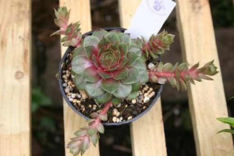 in Germany in 1937 but there is now an impostor also being distributed under the name. Horst Diehm said: "brown rosettes, green tips, purple-brown-red hint, blossom dark pink, 15 cm" Erwin Geiger is quoted on Sempervivum List: "A name with many faces. Often, the picture label of this variety was quickly put into the pots in wholesale. We have three different forms in culture." I bought mine from a local nursery but it is not well-loved in the commercial trade. |