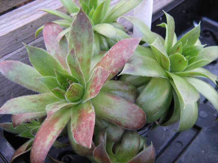 moderate parent but it isn't true, 'Spanish Dancer' has some really good sisters and half-sisters. Horst Diehm said: "Rosettes pale apple green, pink tinge, metallic bronze glow" Erwin Geiger is quoted on Sempervivum List: "An American seedling of 'Cleveland Morgan' from the 70s: The rosettes measure up to 12 centimetres in diameter. The apple-green, slightly bronze-coloured leaves are partly covered with peach. Due to the velvety surface, they appear slightly metallic, especially in early spring. In its home country, the variety was awarded third place in 1978 and received a "Bronze Rosette" there. Sempervivum 'Spanish Dancer' has little growth, because it usually only forms three to four daughter rosettes." Mountain Crest Gardens say: "A small, tight rosette with a variable coloration of lime green, crimson red, or burgundy. The leaves are covered with short, soft hairs that can give it a velvety appearance. The dramatic colors shift wildly throughout the year." |