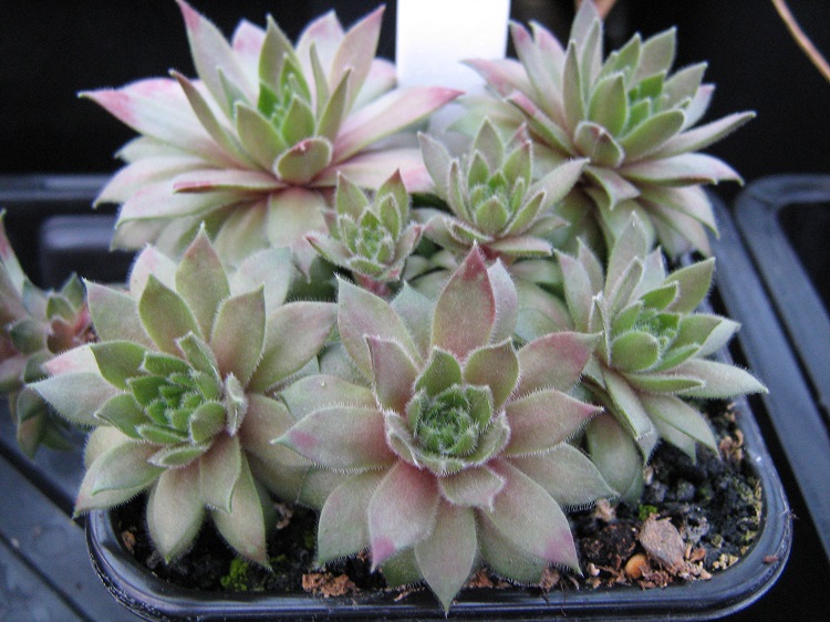 and the plant? Let's just admit that I looked up my notes from the time and found I hadn't made any. Erwin Geiger is quoted on Sempervivum List: "The American hybrid conjures up bright red rosettes with white ciliated foliage. In culture since 1977 and yet hardly known!" He was struggling to come up with a description as well. Mountain Crest Gardens say: "A lovely open rosette with a metallic sheen. It tends to show red and silvery green with coppery overtones and has fine cilia lining its leaves." The AGS online encyclopedia says: "Very compact, small, flat rosettes of pinkish brown. The glabrous leaves are ciliate." |