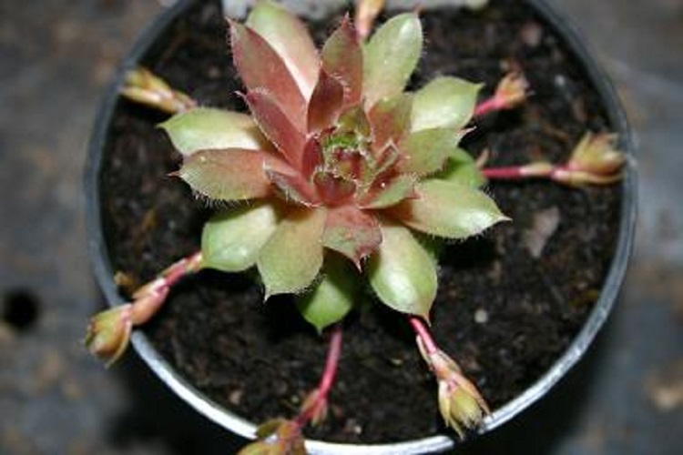 A plant with reddish rosettes that I bought from a local garden centre. It produced pups at the end of long stolons and left a lot of bare space