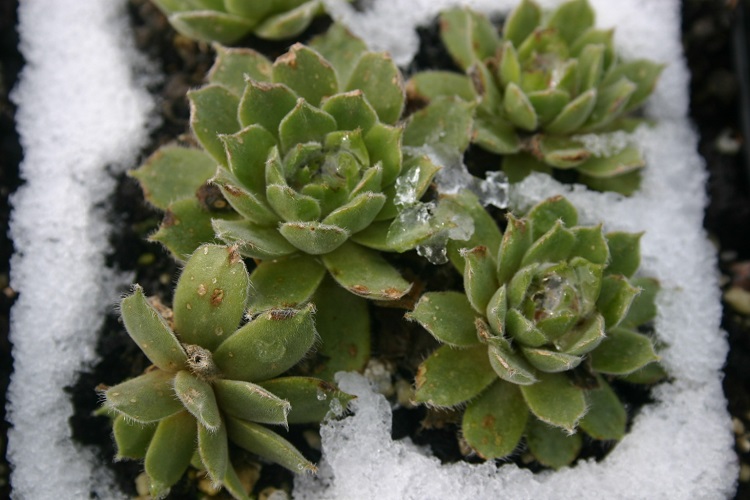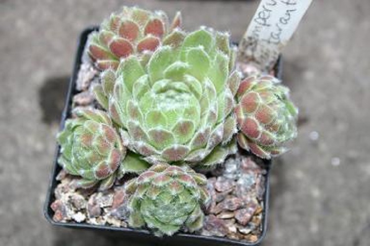 A large and cobwebby cultivar, as befits the name. It made a good looking patch when grown outside. Raised by Sue Rowe in the UK and introduced in 2000. Erwin Geiger is quoted of Sempervivum List: "The variety 'Tarantula' is certainly one of the most beautiful breeds of Sue Thomas from Great Britain. The velvety leaves of the medium-sized rosettes are covered with numerous longer white hairs at the edges and especially on the attached leaf tips. Therefore, we think the name is very well chosen. The different colouring of the individual leaves during the summer months is particularly striking. A must-have for any collection!" World of Succulents says: "Sempervivum 'Tarantula' is a beautiful succulent that forms rosettes of colorful leaves covered with short white hairs. The leaves have a striking color mixture of light green, red, and burgundy during the summer months." |