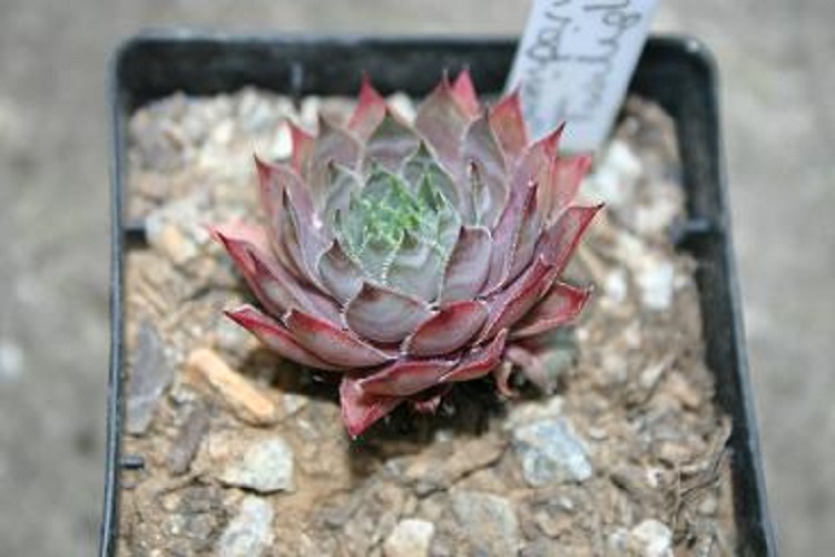 Raised by Bill Nixon in the USA and introduced in 1972. Horst Diehm said: "up to 12 cm large, pointed rosettes, purple violet, dark leaf tips, flower height 12 cm Erwin Geiger is quoted on Sempervivum Liste: "Star-shaped, large rosettes - difficult to describe in color: gray, lavender, bluish and violet-purple. An American hybrid from the 70s." Mountain Crest Gardens say: " A silvery, blue-green rosette that blushes pink to burgundy when stressed by sun, drought, or cold winters. This is a large grower and it can show wavy "watermarks" of natural wax on its foliage." |