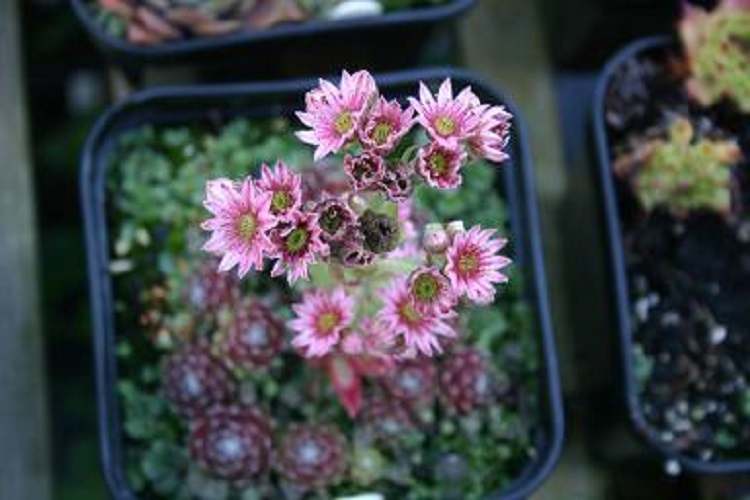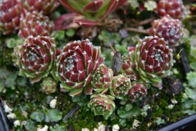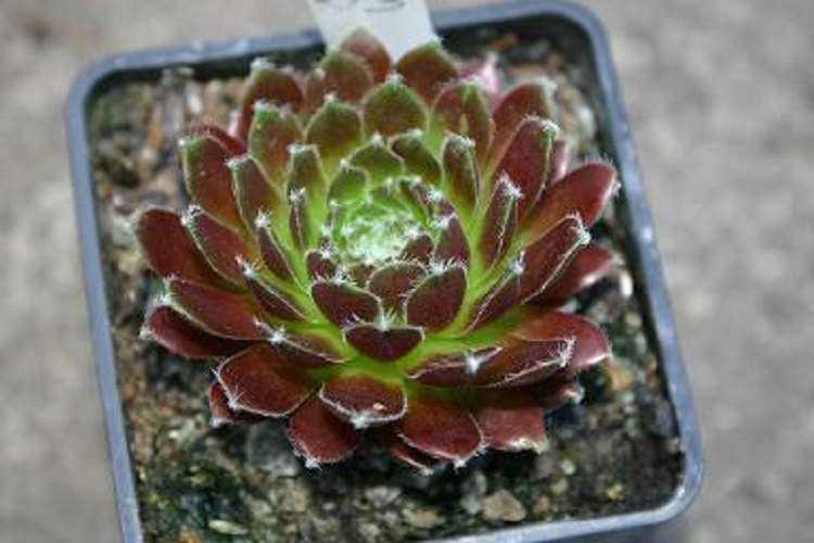A dark leaved form with fine cobwebbing concentrated at the lef tips. Raised by Andre Smits in Belgium and released in 1997.