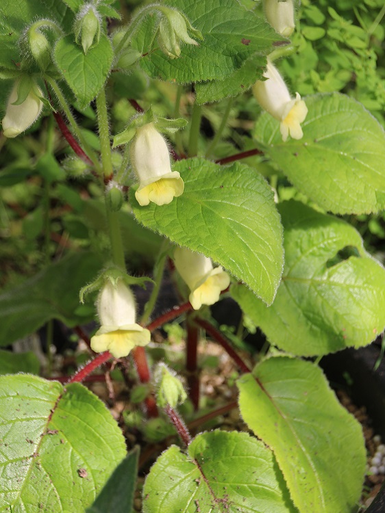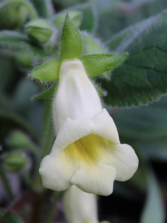 Large creamy yellow flowers, I have seen pictures of rather fetching forms with reddish markings in the throat but mine is as pale as moonlight. My plant came from Plant Delights Nursery, their description says: "This wonderful Brazilian gesneriad makes a small clump to 8" tall x 1' wide. The fuzzy, green, hand-sized leaves form a rosette which is topped from early summer until fall with large, pale yellow flowers, highlighted by cinnamon runway-like streaks to guide pollinators inside the flower. Sinningia conspicua has overwintered nicely for us in well-drained soils and a part-sun site." The Gesneriad Reference web says: "The species is very attractive and under some conditions sweetly scented. It is not difficult to grow, and produces flowers that are quite large relative to the plant size. The leaves are soft and somewhat hairy, unlike those of S. eumorpha which are smoother, and usually darker and somewhat shiny." |