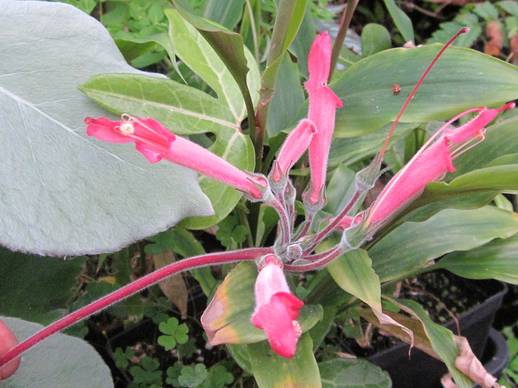 keeping its foliage through the winter and so I am hoping for a strong start in the spring. If it is S. iarae, the Gesneriad Reference web says: "S. iarae is a species that has been introduced to cultivation relatively recently, in large part because of the efforts of Mauro Peixoto of São Paulo, Brazil. The flower has the overhanging upper lip (“galea”) characteristic of related species, such as S. cardinalis and S. hatschbachii. In S. iarae, this galea is often reflexed (i.e. bent upward at the tip). The tuber of this species is usually exposed, in part above-ground. Many member of the genus grow in this manner, and these species often grow on rocky hillsides or cliffs." |