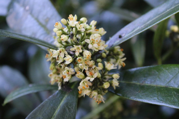 It is a good background plant, and very tolerant! In 1991 the plant was given an Award of Merit by the RHS. The citation says: "To Skimmia x confusa 'Kew Green' as a hardy flowering shrub, subject to confirmation that no previous award has been given under another name..." And in "Matters Arising" for Floral Connittee B on 30th April 1991 they added: The plant which received an Award of Merit on 9 April 1991 as S. x confusa 'Kew Green' had received an Award of Merit as S. laureola in 1977. The most recent award was therefore rescinded." Trees and Shrubs online says: "A male form, which gained fame as a large planting at Kew by the Victoria Gate, misidentified as S. laureola. The origin of this clone is unrecorded, nor is anything known of the provenance of very similar plants at Borde Hill in Sussex. The plants are very handsome, with their large trusses of creamy fragrant flowers. They are somewhat dwarfer than the common male clone of S. japonica, from which they differ in their yellowish white pentamerous flowers, which do not open so widely as in that species. They stand full sun, but should also flower well in shade." |