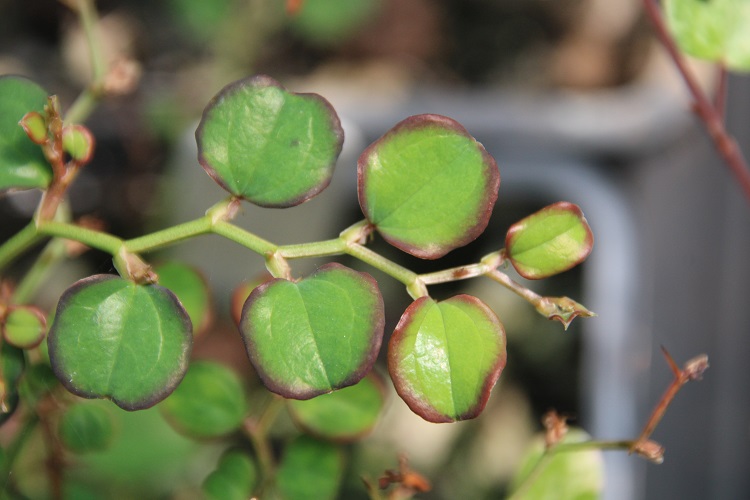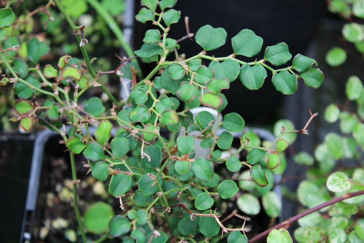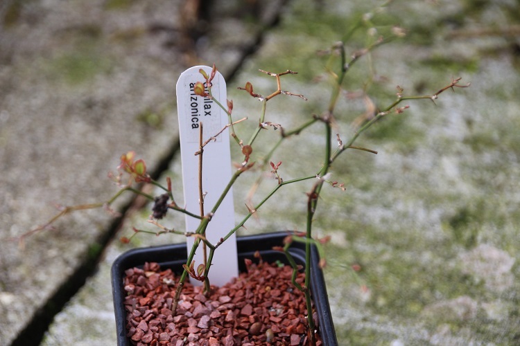 I got it as S. arizonica but it doesn't really match the description of that species. It has glaucous undersides to the leaves and the best match seems to be the Chinese S. nana. Far Reaches Farm say: "I liked the old name of Damacanthus which is what I blurt out when weeding around the spinier Bear's Breeches in the garden. Odd little deciduous woody subshrub of congested twisted stems and stoloniferous habit. Nurseries Caroliniana say: "When one first sees this dwarf sub-shrub/groundcover, the last genus one might suspect is "Smilax". Especially since Smilax was formerly placed in the Lily family, Liliaceae. For all practical purposes, I'll call it a dwarf shrub. It has tiny leaves on zig-zagging stems which is probably more dense than a 'Shillings' or 'Helleri' holly. It is native to the western Yunnan province of China. It does well in sun or part shade and most well drained soils. It suckers from underground rhizomes and gets to only 6-12 in. tall. Unfortunately it is deciduous. I first saw this plant in Japan and was totally captivated by it. One may find this selection listed under Damacanthus indicus, which it closely resembles, but it certainly is not this. All smilax, as far as I know, are dioecious with separate male and female plants and this species blooms in spring with diminutive greenish-yellow flowers which resemble miniature lilies." |