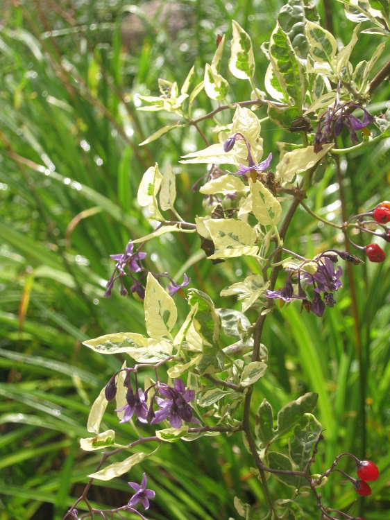 because it is worth noting carefully that the berries are RATHER POISONOUS. In general terms I stay away from poisonous plants because they add worry to the garden, which isn't an especially useful attribute but one or two creep in. This one does a little more than creep. If it is happy the green form can scramble through shrubs to a height of 3m or more. The variegated one is a little less vigorous. I first grew it a couple of decades ago when The Plantsman Nursery closed down. I bought one in their final sale because I am irrationally fond of variegated forms of native plants and I had never seen it before. It grew in a pot for many years without ever looking good . I was always a bit wary that if I planted it in the soil it would seed too vigorously and become a nuisance. In the end I was too cautious and it died in the pot one winter without me noticing. Fast forward a decade or so and I ran into it again at a nursery in north London, looking rather scruffy in a small pot but well worth giving a second chance. I have planted it out in the herbaceous border and perhaps a richer soil will suit it better. Lazy S's Farm Nursery (now closed) said in their catalogue: "Handsome, large, wide variegated leaves with stunning deep violet reflexed flowers with a yellow beak in July and August. Flowers are followed with berries that change from green to yellow to orange to a ripe red at varying times so it is possible to have all four colors at the same time. Good cut flower. A most unusual close relative of, all things, the potato! Can be grown as a free standing shrub or wall climber. Well drained sunny site or conservatory. Like all members of the Nightshade family, berries are poisonous so don't eat them!" |