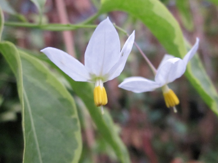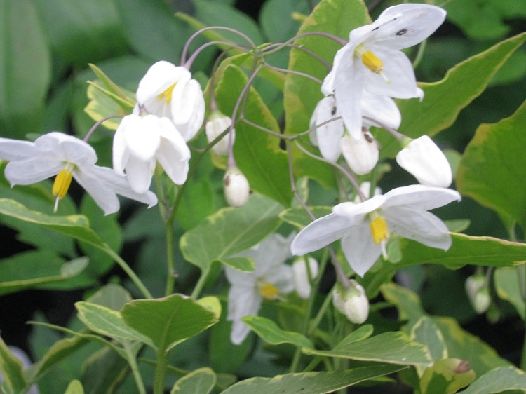"Easy to please potato relative Solanum laxum 'Aureovariegatum' has creamy yellow-margined leaves, crowned with clusters of white flowers.