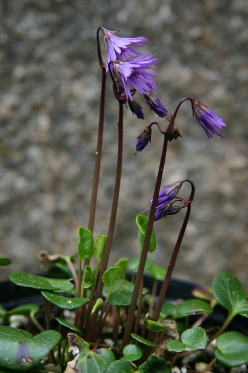 One of the smaller species. The lilac flowers are a delight. Makes a tiny carpet of rounded leaves that can just about compete with the liverworts.