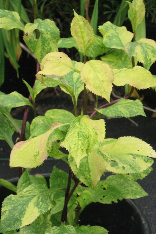 The 'Confessions of a Plant Geek' blog says: "Goldenrods don't get a whole lot of love. They're blamed for hay fever, when the real culprit is ragweed. Most people don't separate the good ones from the bad ones, thinking they're all weeds. Those people are sadly missing out on some great garden plants. Even among the good garden performers, Solidago flexicaulis doesn't get much attention. It's not popular and is rarely offered by nurseries. This is a woodland dwelling species and native to more than half of the US, from Nova Scotia to North Dakota south to Georgia and Arkansas and East. In the trade it is represented by only one cultivar, 'Variegata', which has broad (for a goldenrod) foliage irregularly splashed with gold. All other attributes are identical to the species. Being a woodland species, S. flexicaulis 'Variegata' prefers organic rich soils that are consistently moist. It can take some wetness in springtime, but prefers well drained soils. Morning or evening sun is best for the variegation to remain bright, but it grows in full bright shade just fine. It is also fairly drought tolerant once established. It does fine in my shade garden, which is on the dry side. In spring the foliage emerges with bright yellow splashes of color, sometimes entire leaves may be entirely yellow or green. Variegation does not appear to be consistent from year to year and I've never had entire sections stay yellow or green. Even if rooting cuttings from solid yellow stems they are variegated the next season, much to my dismay! The upside of this is that the solid green sections also are variegated the next season, I've never had this plant fully revert to green and stay that way. This is a fairly well behaved species, it is slightly rhizomatous, but does not spread quickly or get out of hand. Expect clumps to be 4-5' wide in 10 years. Stems can reach 3-4' in height, this makes it a good addition to the mid or back of the shade border. It couples well with green or blue hostas, larger ferns, grasses, and coral bells. In fall flowers are formed in the upper leaf axils to the terminal bud. Some gardeners have called them insignificant, and I strongly disagree. I find them quite attractive and a welcome addition to the fall garden." |