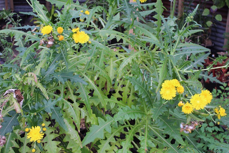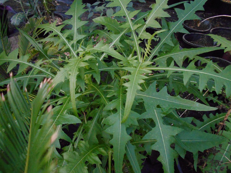 of the leaves. So far it has been slower growing than The winter didn't treat it kindly and I thought I had lost it, but a piece I broke off by accident in the autumn rooted and the original plant grew back from the roots. It flowered in the summer and produced a seed head, but I didn't get any seedlings from it. Just like the other Sonchus, it was killed in the 'Beast from the East' in 2018. Macronesian.org say: "Shrub up to 2-2.5 m tall, woody and branched. Leaves are lanceolate, pinnatifid, with serrated margins, more or less dark green and up to 30 cm long. The inflorescence is terminal, with heads about 2-2.5 in diameter, of deep yellow flowers. Endemic to the Canaries and found on the two central islands (Tenerife and Gran Canaria), between 100-1,000 m, and most common in evergreen forests and thermophile vegetation. A rupicolous plant characteristic of rocky hillsides, stone hedges and the rooftops of old houses, abundant in many zones, particularly on the north-facing flank." |
