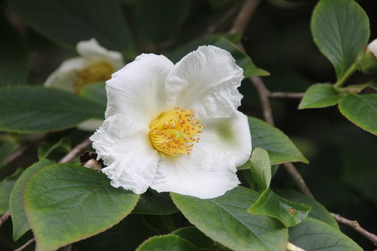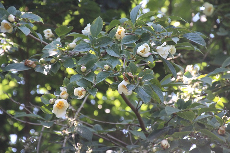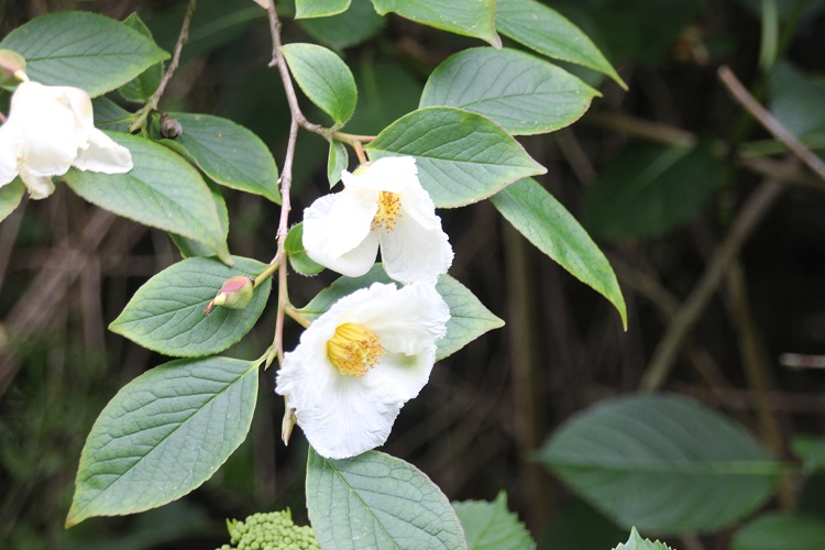 it is a tree that I admire and planting a tiny sapling was the best way to achieve that. My youngster was pot grown and almost as soon as it was planted out it produced a premature flower which was worth photographing even in this rather tatty state. It will be several years before it produces another. I had to wait until 2019 for a repeat flowering. It is out of reach, but worth a distant picture. When I first planted it I was worried that the wind in the garden would be too severe, but the plant has grown sturdily and proved me wrong. Trees and Shrubs online says: "The first material of S. pseudocamellia to be introduced from Korea was seed collected on Chiri San, by Ernest Wilson in 1917, and cultivated at the Arnold Arboretum, where original trees still grow. It was admired there in 1930 by Arthur Osborn of Kew, and material reached England in the following year (Bean 1981). It rapidly became popular and plants of Korean lineage may now have supplanted Japanese stock in general cultivation (Hsu, Boland & Camelbeke 2008). Perceived small differences led to it being described as distinct, and a succession of synonyms has been applied, but it is generally considered that there are no significant distinctions between Japanese and Korean plants. There is some merit in recording the origin for horticultural purposes, however, as Korean trees may be slightly shorter, and are said to have flowers that open more widely than those from Japan; particularly good red autumn colours are also claimed for them (Armitage, Edwards & Lancaster 2014). As they are usually raised from seed they are best treated under the name Koreana Group – which has also been granted the RHS Award of Garden Merit. It has been reintroduced on several occasions in more recent times." The North Carolina Extension GHardener Toolbox says: "The Japanese Stewartia is a small to medium-sized deciduous flowering tree with multi-season interest. It is multistemmed and pyramidal to oval-shaped with low branches. The plant may reach a height of 12 to 40 feet tall and 8 to 25 feet wide. White Camellia-like flowers appear from June to August, and the fall foliage has bright colors. The attractive flaking and peeling bark adds a special interest to the winter garden. The plant is a member of the Theaceae family and is related to the Camellia. The genus's name, Stewartia, is in honor of John Stuart who was a 16th-century Scottish botanist. The spelling was the result of a transcription error. During the 19th-century, the name Stuartia was used; however, the original spelling is now accepted. The species name, pseudocamellia, means "false camellia." |