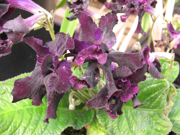 the lack of precision is lost. Dibleys say: "This plant produces a huge head of large deep purple double flowers." The "Bristol's" cultivars were all raised by The Violet Barn in Naples, New York by Dr. Ralph Robinson and his head grower Frank Rouse. On The Violet Barn website they say: "We consider our 'Bristol' streptocarpus hybrids to be superior in may ways to many others. We look for flat, smooth, foliage that is easy to manage. Most don't grow exceptionally large, making them easy to grow on a windowsill or on a light stand. Bloom stems generally are a bit shorter, so that they don't droop or get into the lights on a light stand. Many will have semidouble or double blooms, which means flowers last longer and don't fall from stems when faded. A few are even fragrant!" |