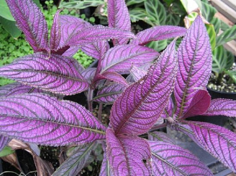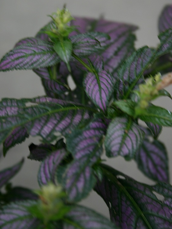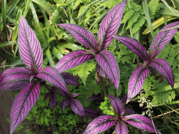 The shining purple leaves are astonishing. The plants grow old and twiggy quite rapidly, and then the leaf size reduces, so it is well worth propagating it regularly. It can get 'toasted' in the greenhouse over winter and I am amazed that it recovers, but we have had two bad winters, and it is still bouncing back and seems to be cheerful. I have never seen it doing the same outside, but I suspect it needs the warmth of the greenhouse to breathe life back into it, and allow enough growth before the winter comes again. I have flowered it several times but never managed to get a decent picture. In the Journal of the Royal Horticultural Society, Ann Bonar wrote in 1980: "As a native of Malaysia, Strobilanthes dyerianus requires a minimum temperature of 10degC (50degF), and plenty of water during summer; if kept dry it is prone to greenfly infestation. It also needs to be kept in good light - but out of direst sun in summer - to maintain the leaf colouring. However, as light can be inadequate in British winters, it is better to renew the plant from easily rooted tip cuttings taken in spring with bottom heat." Plants of the World online has redced the species to S. auriculata var. dyeriana and says: "The native range of this variety is Bangladesh to Thailand. It is a subshrub or shrub and grows primarily in the wet tropical biome." The Missouri Botanic Garden website says: "It is a soft-stemmed, tropical, evergreen shrub or subshrub that is grown primarily for its attractive iridescent purple foliage. It grows 3-4’ tall in frost-free climates, but typically grows 1-3’ in the St. Louis area. Features ovate-lanceolate dark green leaves (to 8” long) that are flushed with silvery-purple iridescence above and dark purple beneath. Spikes of tiny violet 5-lobed funnel-shaped flowers usually do not bloom during the St. Louis growing season, but infrequently may be seen on overwintered plants in greenhouses. Flowers appear in short cone-shaped inflorescences, thus giving rise to the less frequently used common name of Burmuda conehead. " |