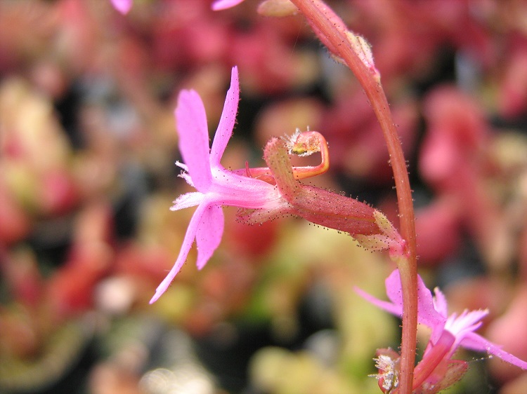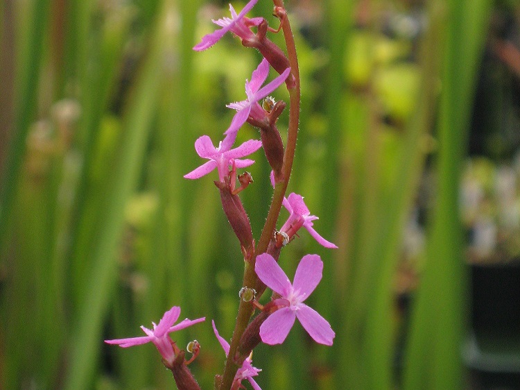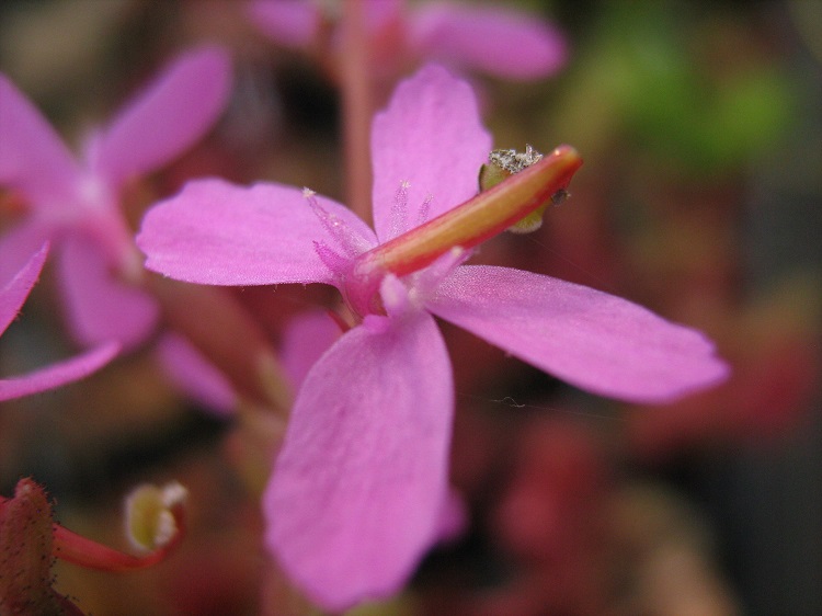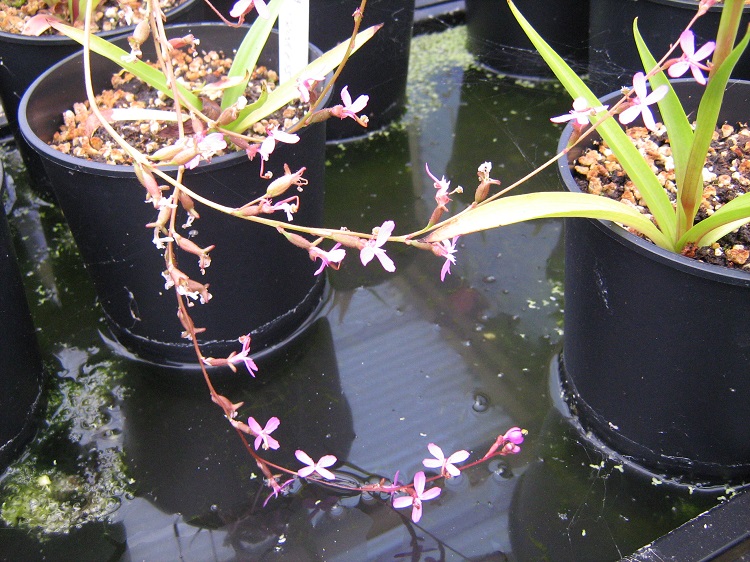 A small species that seems to have prospered wherever I have placed it. Selected in 2001 by Todd Layt of Ozbreed Pty Ltd and distributed by micropropagation. Wikipedia says: "Little Saphire is of a shorter stature, has shorter but wider leaves, larger flowers, and a deeper blue-green foliage colour than the parent species. It also begins to flower earlier in the season than the other S. graminifolium cultivar, Stylidium graminifolium 'ST111', also known under its tradename Tiny Trina." |