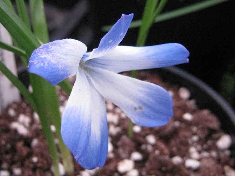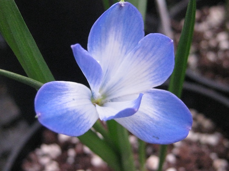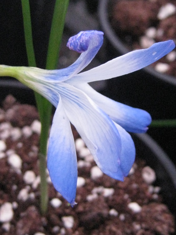 that softens and yet emphasises the colour. It received an Award of Merit when shown to the AGS in February 1995. In the write-up Tony Lord says: "I have always been fond of Mars bars and will wolf one downbefore you can utter 'midriff mathem'. But halfway through the second one, feelings of queasiness take over and the remainder is usually stowed until my appetite is restored. Tecophilaea cyanocrocus, with its relentlessly breathtaking gentian blue, has almost the same effect on me: the first pan of late winter is a glorious sight but repeated exposure leaves me longing for a little light relief. Which is why I prefer the softer blue and large white centre of 'Leichtlinii'. It was named (as var. leichtlinii) by Regel of St.Petersburg after German, Max Leichtlin, who introduced many bulbs at the turn of the century. Much has been written about the status of this species in the wild, about its hardiness, and about the debate on whether or not to dry off the pans in summer. To this, I would only add that since 'Leichtlinii' comes reasonably true from seed, I don't understand why it is still uncommon. Offsets are often produced as well, yet open almost any catalogue and you will find that just one corm is outrageously expensive (the same applies to T. cyanocrocus itself, which is easily grown, widespread in cultivation and very quickly increased by seed). A few offspring will inevitably resemble the straight species in intensity, sometimes with a smaller, fuzzier white eye, whilst recently I saw, winking suggestively from a nursery stand at Vincent Square, a childe of the violet-purple 'Violacea' which, with its large white eye, was obviously the result of chance mischief with 'Leichtlinii'. Footnote: I was chatting with John Watson recently. He thinks it probable that wild populations still exist; the Chilean blue crocus once grew on some of the hills around Santiago and nowadays very little botanising occurs at those altitudes in spring. Now, where is that half-eaten chocolate bar...?" |