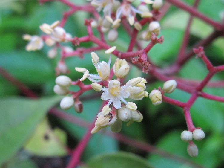 and T. ruticarpum, a large shrub from China, crossed my path and followed me home. Unfortunately, I don't remember a single thing about it. I have the picture to demonstrate that it was in the garden (the leaves with it are Impatiens cymbifera growing by my back door). I have a note in my accessions list confirming when and where I bought it, but that is as much as I know. Either it is sitting in the Hedychium house somewhere and I haven't noticed it, or I planted it somewhere and have forgotten it. In either case it will turn up again eventually. Trees and Shrubs online says: "Tetradium ruticarpum was apparently not successfully introduced by the earlier generation of plant collectors in China (Flanagan 1988), but recent expeditions have more than made up for the omission and it is now to be found in many collections across our area. Given its broad range it is not surprising that collections of T. ruticarpum have come from diverse areas, including Taiwan (BSWJ 3541, for example, made in 1996). Tetradium ruticarpum grows rapidly and well, flowering when young. It enjoys the heat of the eastern United States, as evidenced by vigorous trees seen at the JC Raulston Arboretum (planted in 1996 and up to 8 m in 2006), but is also happy with cooler summer conditions. At Tregrehan it has shot up to nearly 10 m in eight years. It can be expected to make a broad-crowned rather than tall tree, however (T. Hudson, pers. comm. 2005). As with T. fraxinifolium, the young leaves are reddish brown but expand to a deep green, that admirably sets off the pale inflorescences. The red fruits are very handsome." |