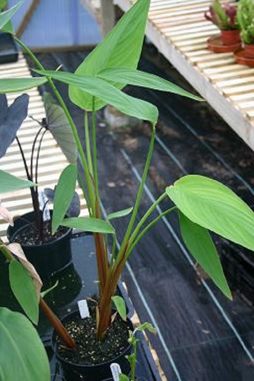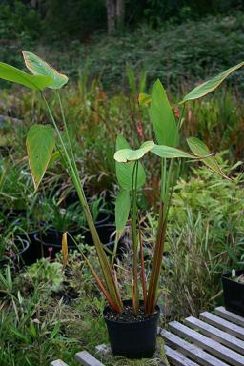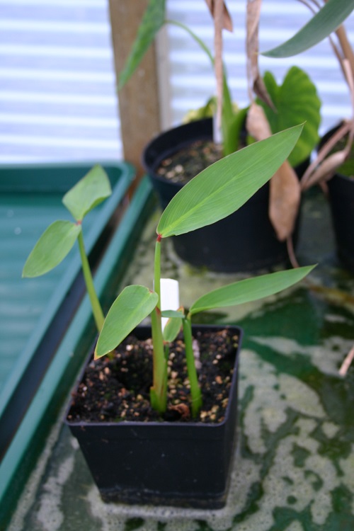 Arrived from a nursery in coastal Thailand as Thalia'Ruby Stem' but I think it is T. geniculata var.ruminoides. It prospered well for the first season, but sadly I was unable to keep it through the winter. Chicago Botanic Garden says: "Red-stemmed thalia, also known as alligator flag, is a large tropical aquatic plant, found in Florida, tropical America and Africa. The paddle-shaped leaves with thick stalks can grow up to 4' tall. The complex light purple flowers emerge from large purplish-green bracts all summer long and are borne atop 10-foot stalks that are deep red at the bases. In the north these plants can be grown in pools and then brought in for the winter. They can be cut back severely for use the following spring, but they must not be allowed to dry out." Charleston Aquatic and Environmental ltd.say: "Thalia geniculata ruminoides is a North American native perennial that thrives in shallow water to wet soils in full sun to part shade. This variety of Thalia stands out for its brilliant red stalks. It is a clump forming species and can reach heights up to ten feet tall. Red stemmed Thalia is adored for it very tropical look." |