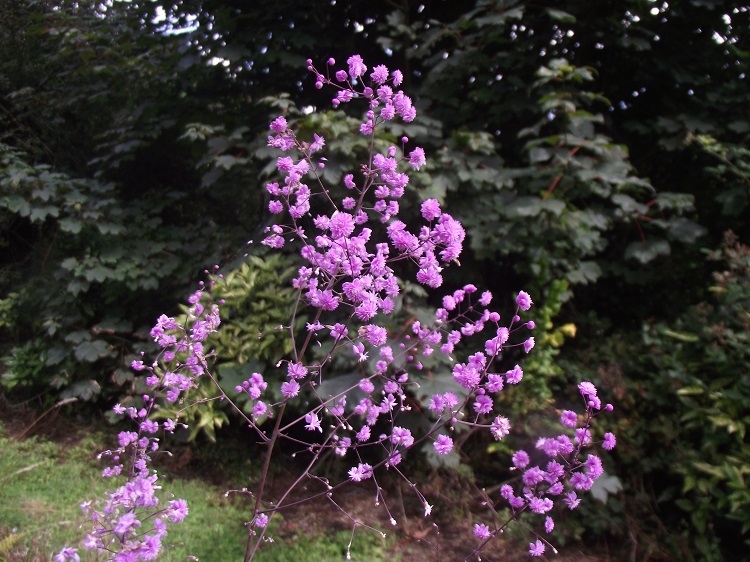 with me instead of growing upright, but perhaps moisture and good soil will encourage it. It hasn't increased greatly in a decade but it has hung on to its space tenaciously. Plant Delights Nursery say: "The airy maidenhair fern-like, deer-resistant foliage of Thalictrum delavayi 'Hewitt's Double' adorns the 4' tall stems which are topped from midsummer through fall with large cloud-like flower heads of small, lavender, pompom-like, double flowers...simply a sensational textural element in the summer garden." It is a plant that has been around for a long time, it is included in the RHS Encyclopedia of Gardening (1951), but I haven't been able to discover its origin so sadly Hewitt is currently lost in the mists of time. I have a vague memory that even when I was a teenager people were unaware of its origin. |