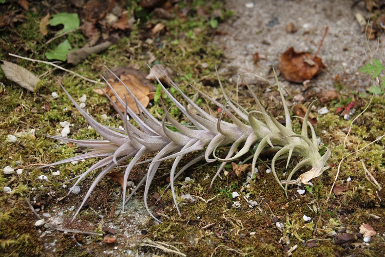 The silver form of Tillandsia bergeri is greyer than my other form, but it also has more compact growth and a more upright habit. It hasn't yet been tried for its winter tolerrance here. I got it from Andys Air Plants and he says: "This lovely plant I belive is unique to my collection. It was gifted to me many years ago by a local plantsman Dr. Rob Senior. He told me he had collected it while on holiday in Peru. Wether he got it from the wild or a garden I do not know. Im calling it T. bergeri silver form as I do not know of another name for it. It has silver/grey leaves as opposed to the green leaves of the normal T. bergeri. The flower spikes seem identical to the species bergeri." |