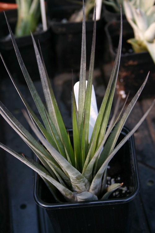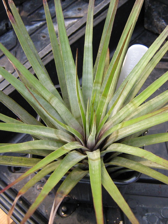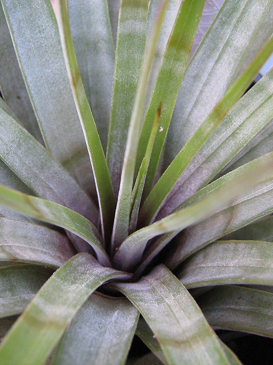 A variable species from Mexico and Honduras. Can form large clusters of rosettes. It didn't like a cold winter, even dry in the greenhouse. Walter Rauh says: "This species is very variable in regard to size, coloration and number of bloom spikes. There are all sorts of transitions between T. concolor and T. fasciculata. From Florida and Mexico to Columbia and Peru; usually epiphytic in dry forests at altitudes of 600-1,900m. Robust, easily grown. Splendid at bloom time. Bloom spikes and their coloration last a long time. Suitable only for larger greenhouses." The Lady Bird Johnson Wildflower Centre says: "An air plant with inconspicuous flowers in the axils of showy bracts, which are usually red. This is the most common air plant (epiphyte), especially on Bald Cypress. Air plants get their nourishment from the air, rain, and minerals leached from the host tree. Among the 15 other erect species of Tillandsia that occur in Florida are Ballmoss (T. recurvata), with narrow leaves forming grayish ball-like clusters on branches of deciduous trees, especially oaks; Needle-leaf Wild Pine (T. setacea), with very narrow, needle-like leaves; T. pruinosa, with a distinctive coat of hoary scales; and Giant Wild Pine (T. utriculata), the largest species in the United States, with leaves reaching 2 feet (60 cm) in length and a flowerstalk up to 6 feet (1.8 m) tall." |