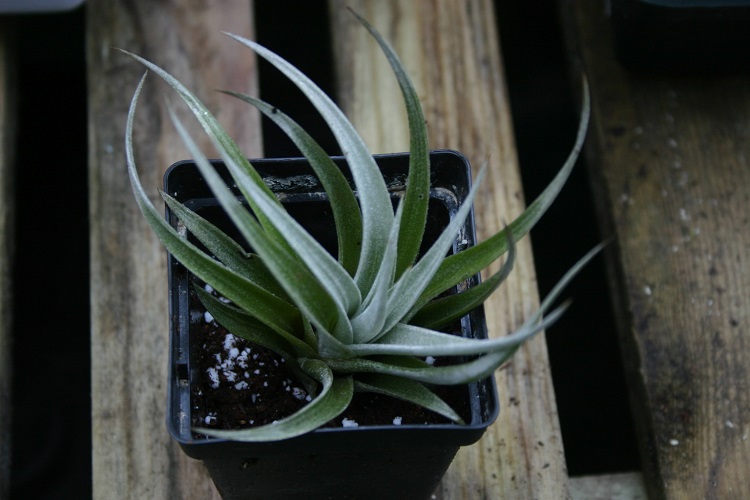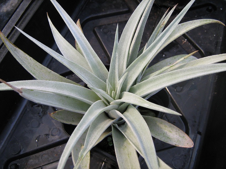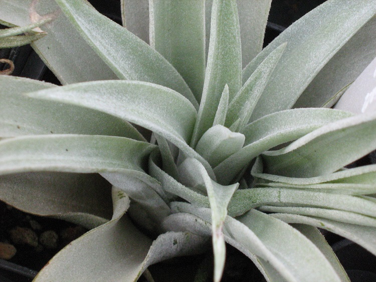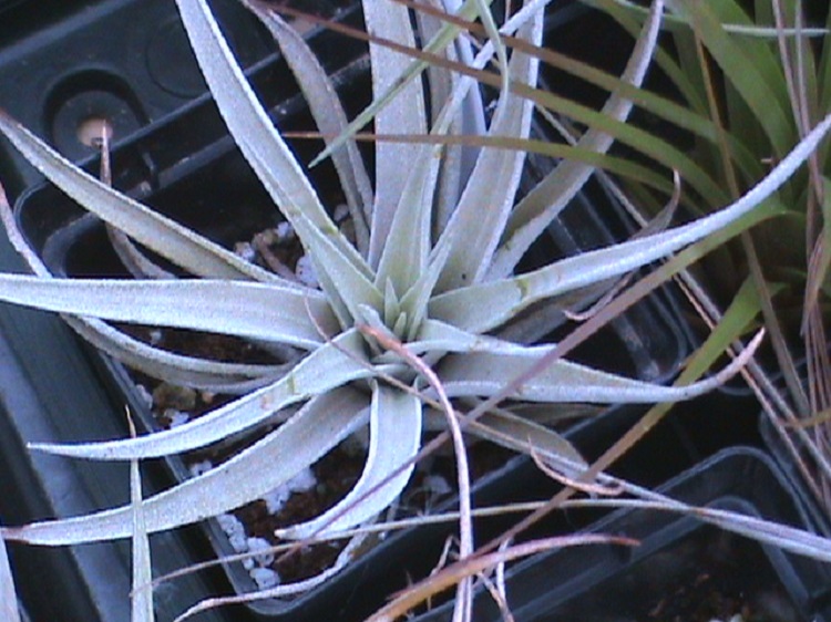 I obtained it originally as T. himnorum but this hs now been identified as T. harrisii. A species with broad silvery leaves. I have only had it for a year or so, and can't tell you much about it. As it grows and establishes, it is getting whiter and more spectacular. Air Plant Shop says: "The Tillandsia harrisii is a striking species native to Guatemala, named after its discoverer, Bill Harris, who identified it in the early 1980s. " Bromeliads in Australia say: "Plant: in large groups, with to 80cm long stem, the back portion dies back and the front part promotes new roots, growing upwards, making a large, to 35cm wide ca. secund rosette. Habitat Growing on rocks, near river Teculutan, at 500m, between La Piedra de San Antonio and Piedra del Galapago, El Zapato, Zacapa, Guatemala. it is named after collector and exporter Bill Harris murdered in 1985 in Guatemala." |