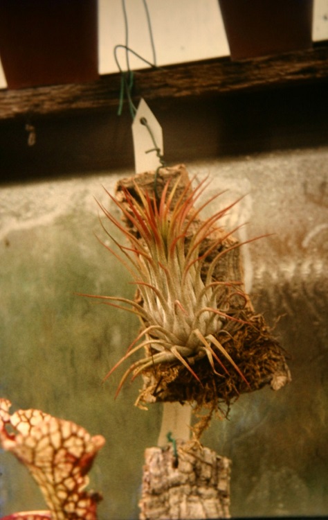I have grown it several times and it has seemed happiest when mounted - right up to the point when I forget to water it for a month and it dies. Werner Rauh says: "ionantha violet-flowered; refers to the intense violet flower colour. Mexico (from the Atlantic and Pacific coasts to about 1,300m), Guatemala, Nicaragua. Easy, mooderately damp, bright and sunny, can be grown outside in summer. The leaf tips become bright red at bloom time. A favourite species sought by tillandsia fanciers. Because of the small size, suitable for terrariums." Andy's Air Plants says: "When the ionantha's come into their flowering process they color up really well turning fiery red, and then will produce the lovely purple, tubular flowers, then they will produce pups or offsets around the base which will grow and flower again when they reach maturity which is generally one year. |