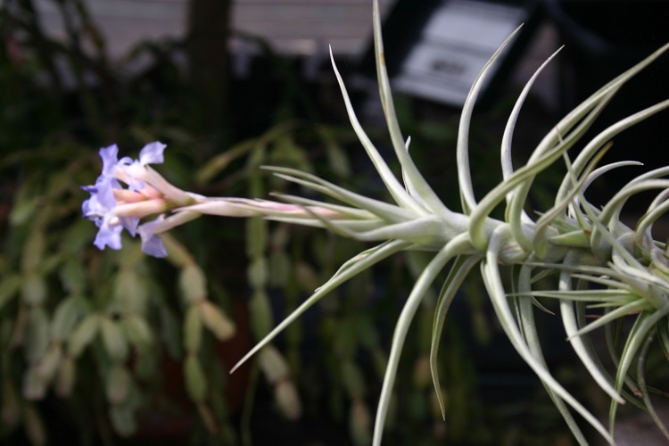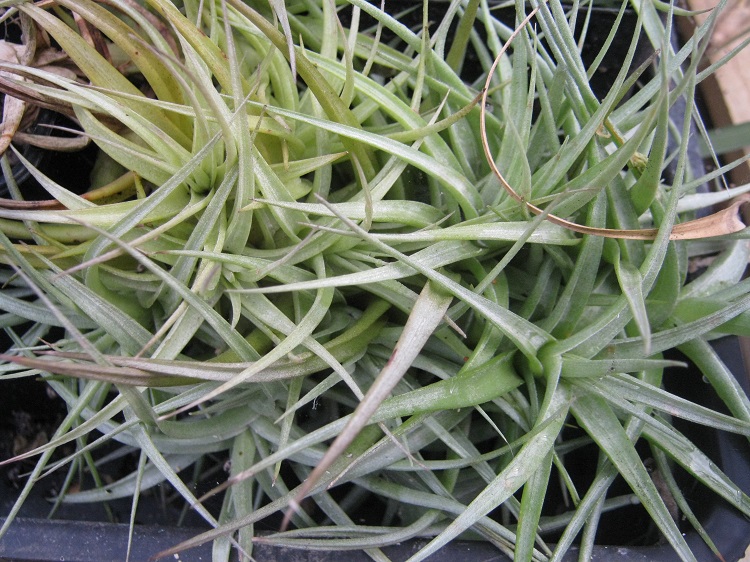 The majority of Tillandsias are extremely tender, with broad green leaves. The grey leaved Tillandsia grow epiphytically, or lithophytically, or telegraphwire-ophytically, and are drought tolerant, and neglect tolerant. This one has never had a root ball, and grows out of an empty pot. It seems to prosper in its own slow fashion. When it did finally flower, it was spectacular. I think it was responding to an increase in light levels after I moved it into a poly tunnel. My plant came labelled as T. recurvata and although I have some misgivings, I m not going to change it yet. Matt Candeias says on his 'In defense of plants' blog: "Tillandsia recurvata is native throughout an impressive chunk of the Americas, from the southern United States through to northern Argentina and Chile. Wherever temperatures rarely dip below freezing, T. recurvata can make an easy living. One of the most remarkable aspects of this species is the array of habitat types in which it grows. This hardy little air plant is equally at home in sub-tropical conditions as it is arid desert habitats. Its ability to tolerate heat, drought, and plenty of air pollution has led to its colonization of urban environments as well. Probably the most incredible feat of this species has been its conquest of the human environment. Throughout its range you can find T. recurvata thriving on man-made structures like power lines. " |