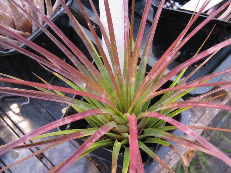 and when I finally went to rescue it, it was too late to save). This young plant seems to be growing slowly into a replacement. Andy's Airplants says: "Tillandsia tricolor v. melanocrater is a great species of Tillandsia it is easy to grow, it does not require the air-movement that the silver leaved species enjoy, making it very suitable for windowsills, bathrooms and terrariums. It will also grow well in bright conditions with a regular wetting. The plant responds well to being mounted or grown in a pot with just potting bark as a medium. Tillandsia tricolor comes from Central America and Mexico where it grows as an epiphyte on trees. It has dark green leaves that can color up very nicely if given high light levels. The flower spike is impressive too with red yellow and green stem and bracts, the flowers are puple and tubular." Tillandsia tricolor var. melanocrater has now been elevated to species status, as Tillandsia melanocrater, however people are not adapting rapidly and for the moment I am going to leave things as they are. |