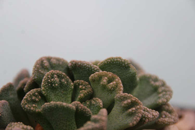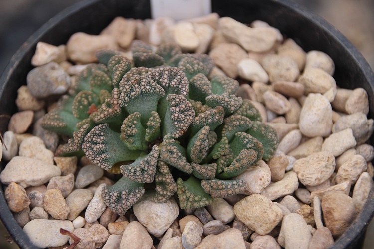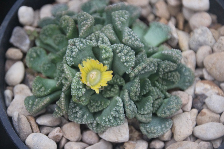hardy if it is dry. Penberth Plants say: "These small succulents leaves are cumpled and wrinkled like a stone but have lovely colour changes through the year as the temperature change and the leaves mature at different stages. With reds, purples greens and blues the small compact habit of these plants are always changing in colour and then they produce a late summer flower of small yellow daisy like blooms above the foliage to the dizzy height of approx 40-50mm. These may be small but don't under estimate these small but spectacular South African plants. Maximum spread is 75mm." The Llifle encyclopedia says: "With a white incrustation to the leaves, it is confined to limestone outcrops. This is probably a rare case of protective coloration in plants akin to that found in the animal kingdom and these plants blend in well with their surroundings. Origin and Habitat: South Africa (Bushmanland, Upper Karoo). This species has variously coloured leaves, usually grey or blue-green, densely covered at the apex with whitish, creamy grey, ochre, red or bluish rough tubercles (depending on plant's origin). Flowers: 2 cm orange-yellow flowers in late fall and winter." |